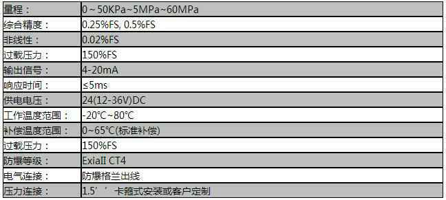 PT124B-283平膜型防爆压力变送器,测量端采用特殊处理坚固的齐平膜片,被测介质中坚硬微粒不会损坏隔离齐平膜片。结构紧凑、耐腐蚀,抗震动、抗微粒冲击、宽范围温度补偿。选用防爆外壳,带LCD显示。特别应用于液压、油田,矿井,化工,电力,锅炉,天然气等自动化领域的流体压力测量与控制。